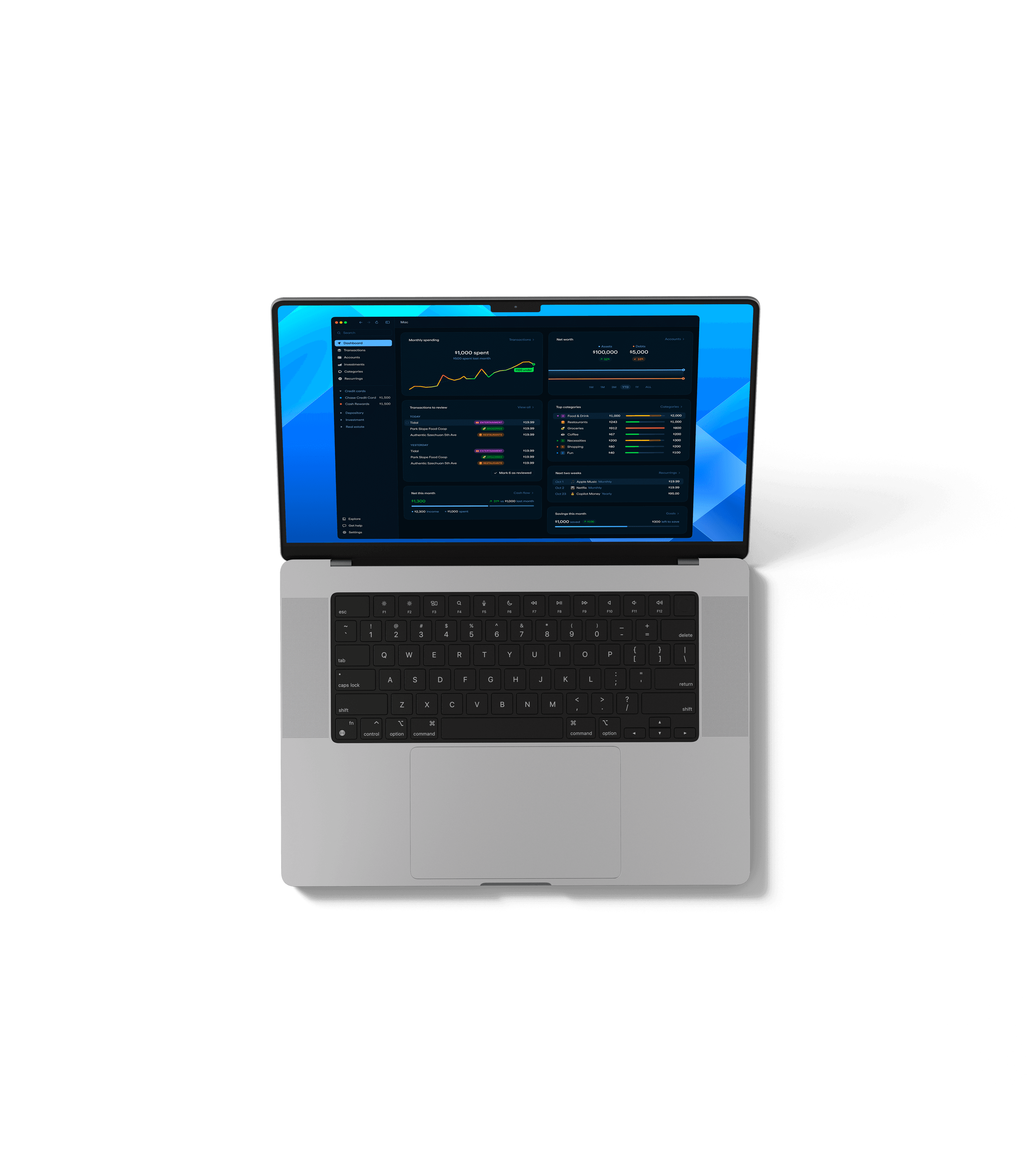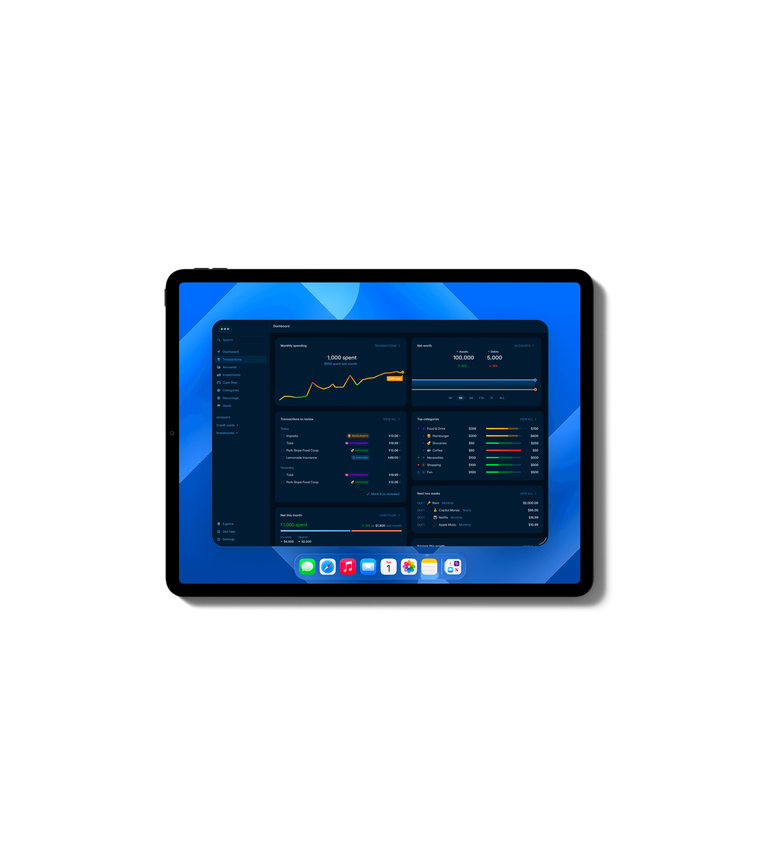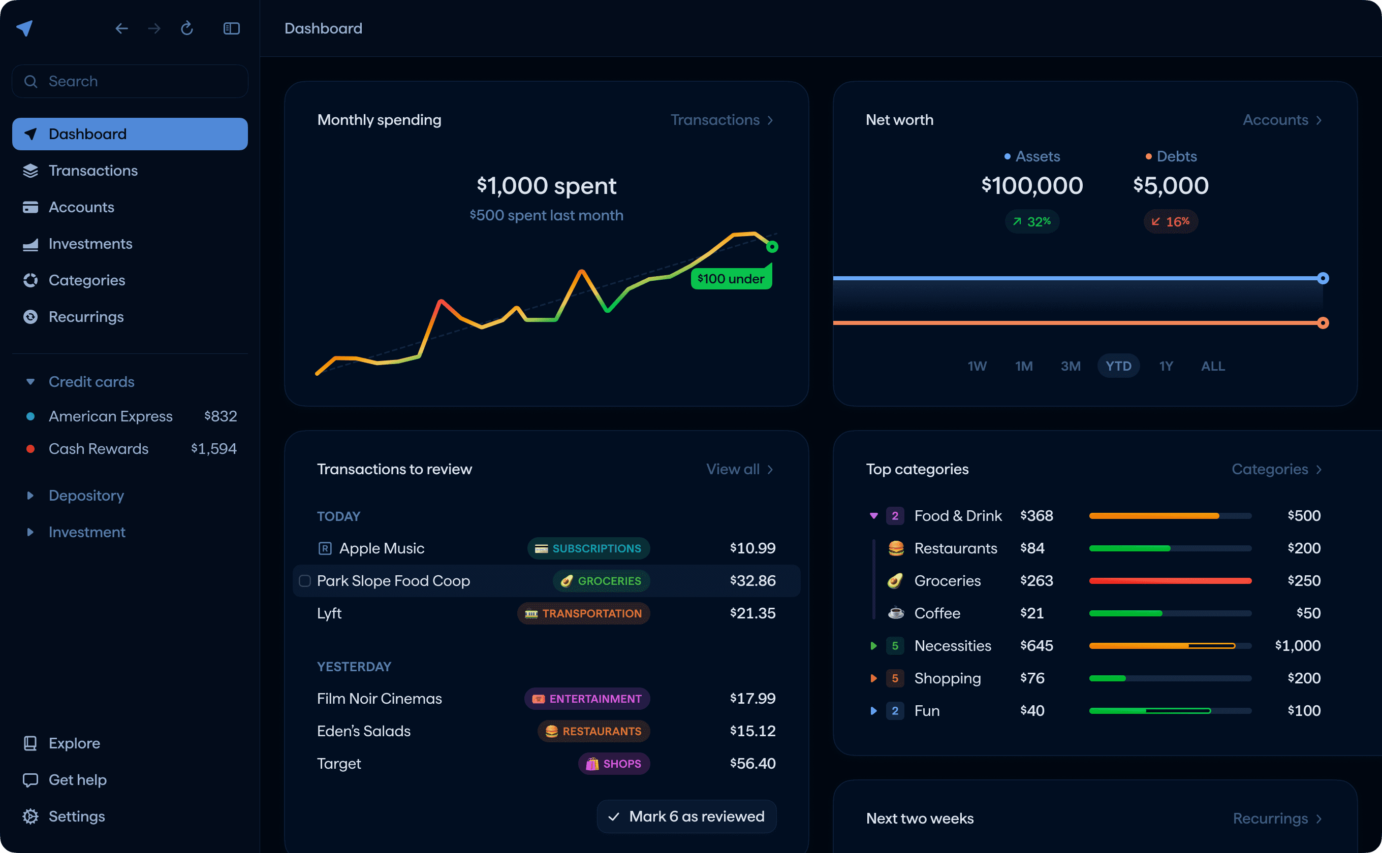 Navigate your finances with confidence. Track spending, budgets, investments, net worth, and get personalized recommendations.